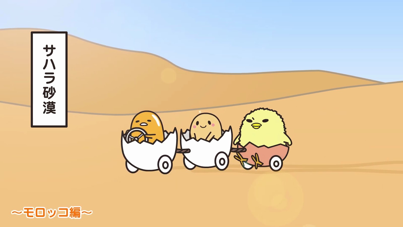 TBS晨間節目"あさチャン!"吉祥物(Since 2014/3/31) 動畫極短篇每週5集, 每集約1分鐘, 中間穿插Unitard man (Ep18)伴隨無厘頭的洗腦主題曲, 示範跳詭異的"Gudetama舞"; 更詭異的是看久聽久了竟然都覺得可愛, 而且會忍不住跟著唱。可能出現在任何[含蛋成分]的食物之中, 變化形態豐富, 可維持新鮮感, 但最王道的還是原始蛋黃形態; 其實仔細想想, 它的個性負面/消極/懶散又有點小壞心眼, 如果是個人的話就很討厭,